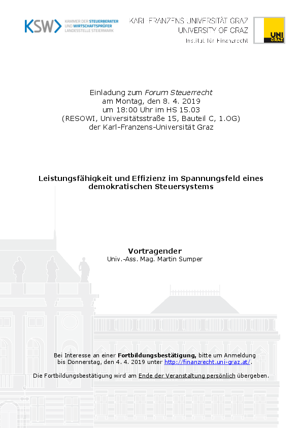 Gerne laden wir Sie zu unserem nächsten Forum Steuerrecht am 8. April 2019, um 18.00 Uhr im HS 15.03 ein, in dem unser Mitarbeiter Mag. Martin Sumper zum Thema "Leistungsfähigkeit und Effizienz im Spannungsfeld eines demokratischen Steuersystems" vorträgt.